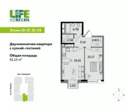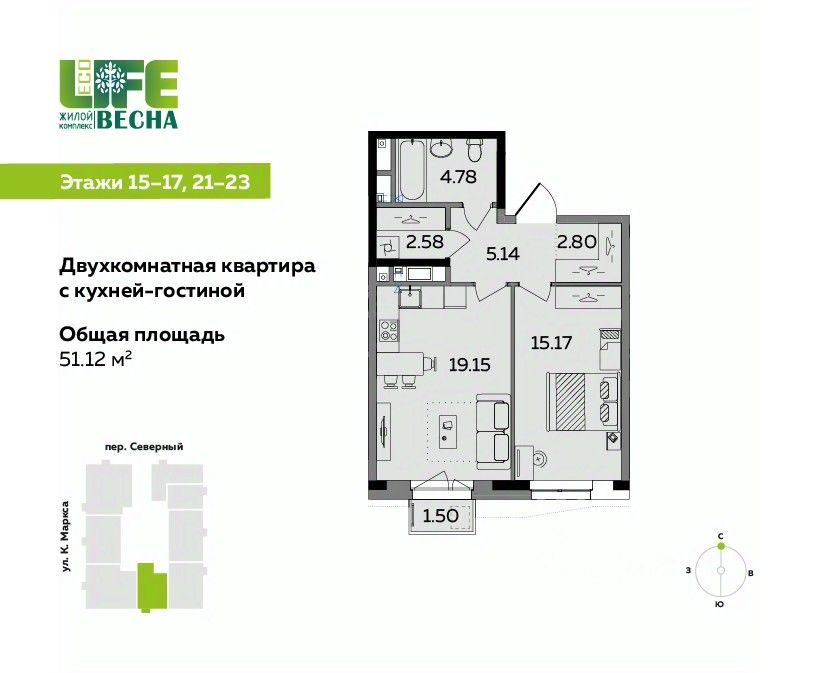 Продаётся 2-комнатная квартира с кухней-гостиной от девелопера UDS в ЖК ECO Life Весна, дом 3. Площадь — 51,12 м². Дом бизнес-класса в центре Ижевска, рядом с администрацией города.