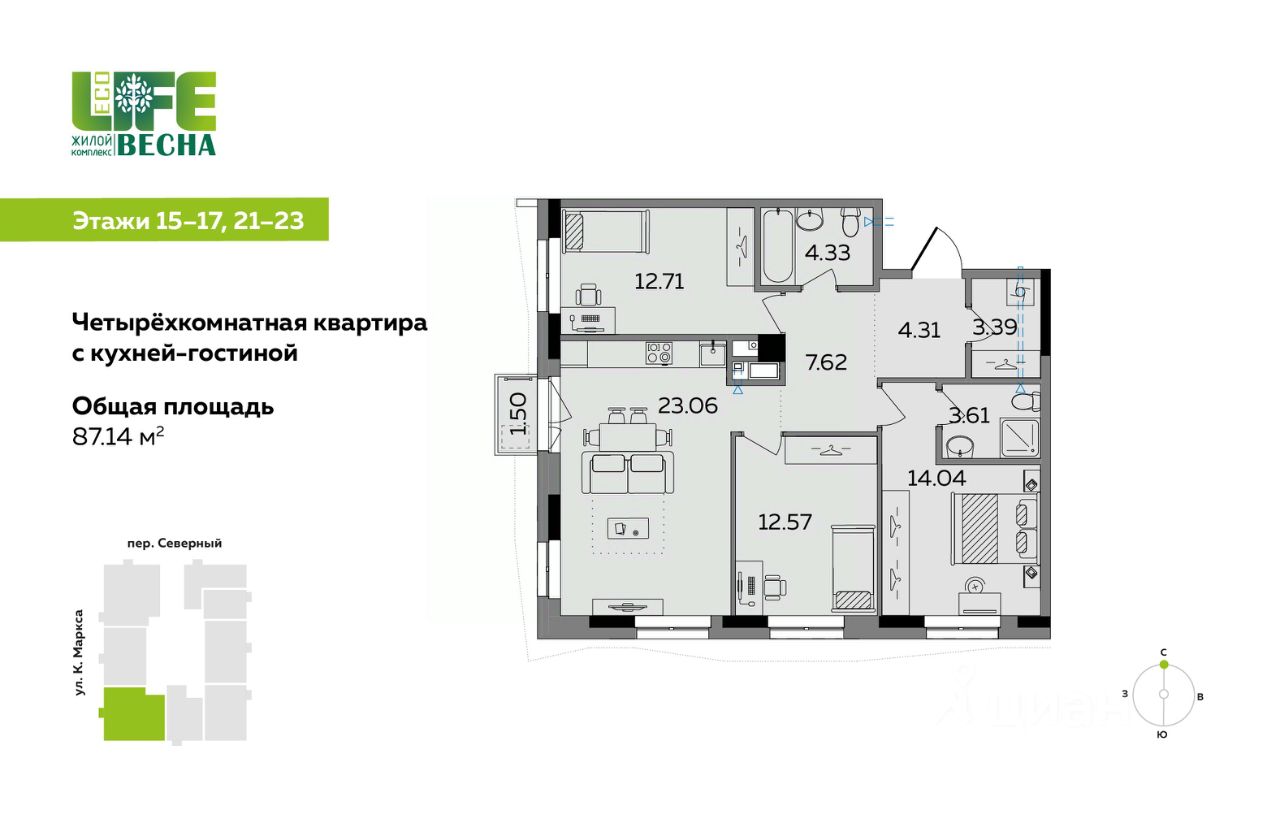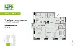 Продаётся 4-комнатная квартира с кухней-гостиной от застройщика в ЖК ECO Life Весна, дом 3. Площадь — 87,14 м². Дом бизнес-класса в центре Ижевска, рядом с администрацией города.