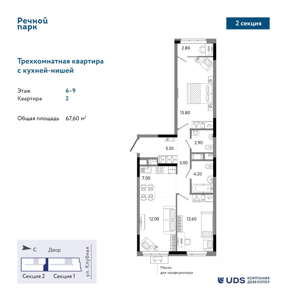 Трехкомнатная квартира евро-планировки в 17-этажной секции ЖК "Речной парк", дом 2. Кухня-гостиная 19 м2 правильной прямоугольной формы. 2 отдельные спальни, комнаты родителей и детей не граничат друг с другом. В спальне родителей большая выход на теплую лоджию. 2 санузла, в одном из них можно разместить стиральную машину. и восток. Грязная зона прихожей отделена от жилой части, есть ниша для шкафа под уличную одежду и обувь. Квартира на 2 стороны света - окна выходят на север.