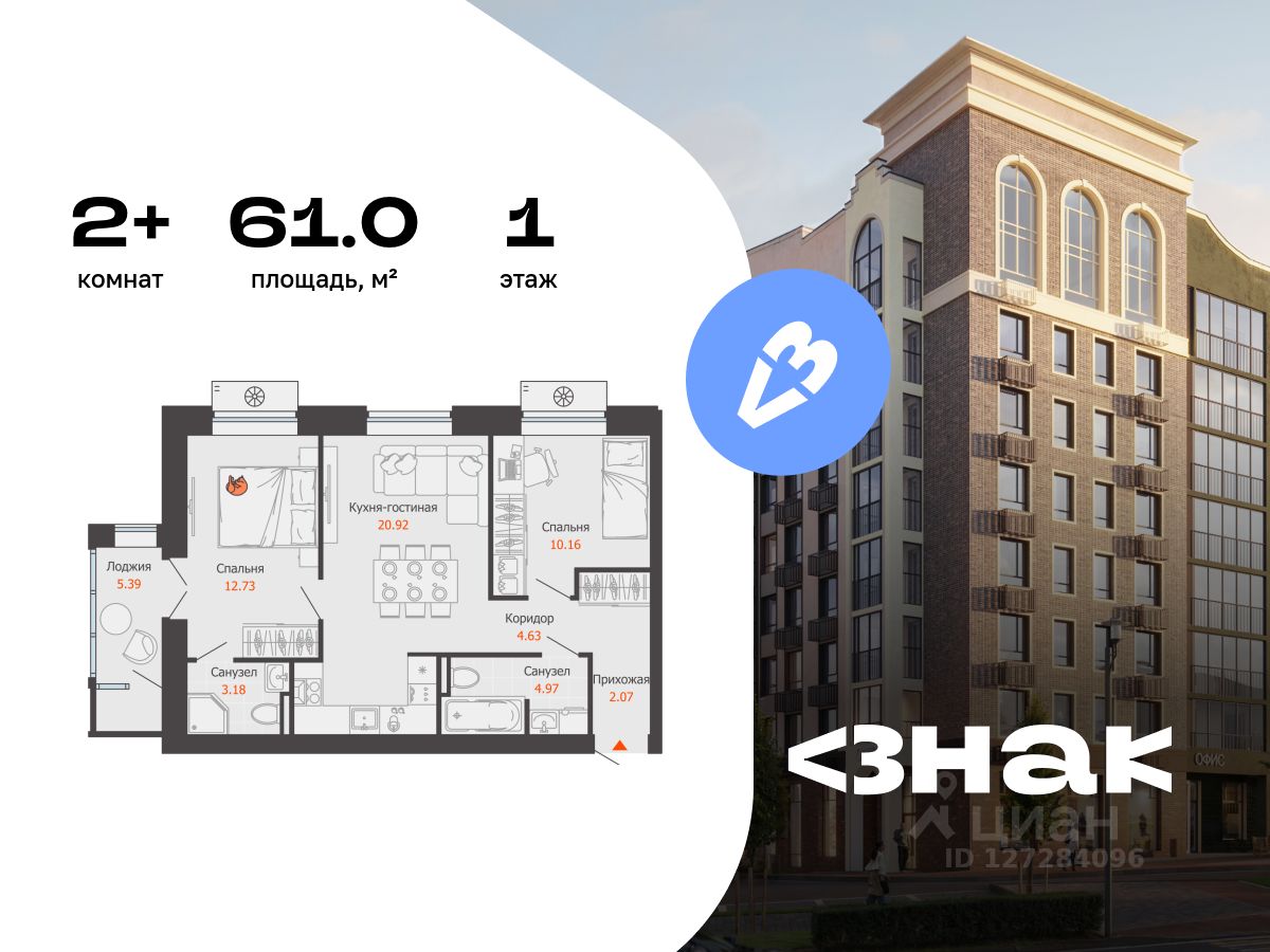 В новом жилом комплексе комфорт-класса "Знак" продается 2-комнатная квартира площадью 61.00 кв. м с отделкой white box. Квартира находится на 1 этаже 8-этажного корпуса 2. Девелопер проекта - федеральный застройщик "Железно".