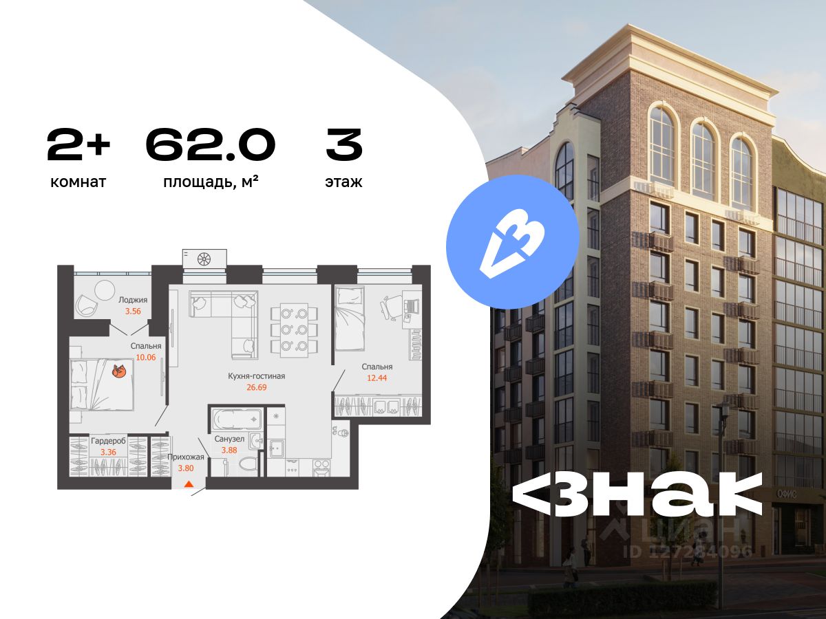 В новом жилом комплексе комфорт-класса "Знак" продается 2-комнатная квартира площадью 62.00 кв. м с отделкой white box. Квартира находится на 3 этаже 8-этажного корпуса 2. Девелопер проекта - федеральный застройщик "Железно".