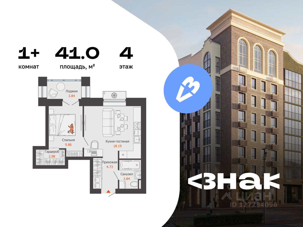 В новом жилом комплексе комфорт-класса "Знак" продается 1-комнатная квартира площадью 41.00 кв. м с отделкой white box. Квартира находится на 4 этаже 8-этажного корпуса 2. Девелопер проекта - федеральный застройщик "Железно".