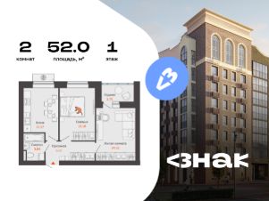 В новом жилом комплексе комфорт-класса "Знак" продается 2-комнатная квартира площадью 52.00 кв. м с отделкой white box. Квартира находится на 1 этаже 8-этажного корпуса 2. Девелопер проекта - федеральный застройщик "Железно".