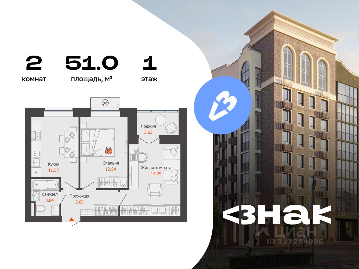В новом жилом комплексе комфорт-класса "Знак" продается 2-комнатная квартира площадью 51.00 кв. м с отделкой white box. Квартира находится на 1 этаже 8-этажного корпуса 2. Девелопер проекта - федеральный застройщик "Железно".