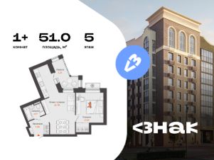 В новом жилом комплексе комфорт-класса "Знак" продается 1-комнатная квартира площадью 51.00 кв. м с отделкой white box. Квартира находится на 5 этаже 8-этажного корпуса 2. Девелопер проекта - федеральный застройщик "Железно".
