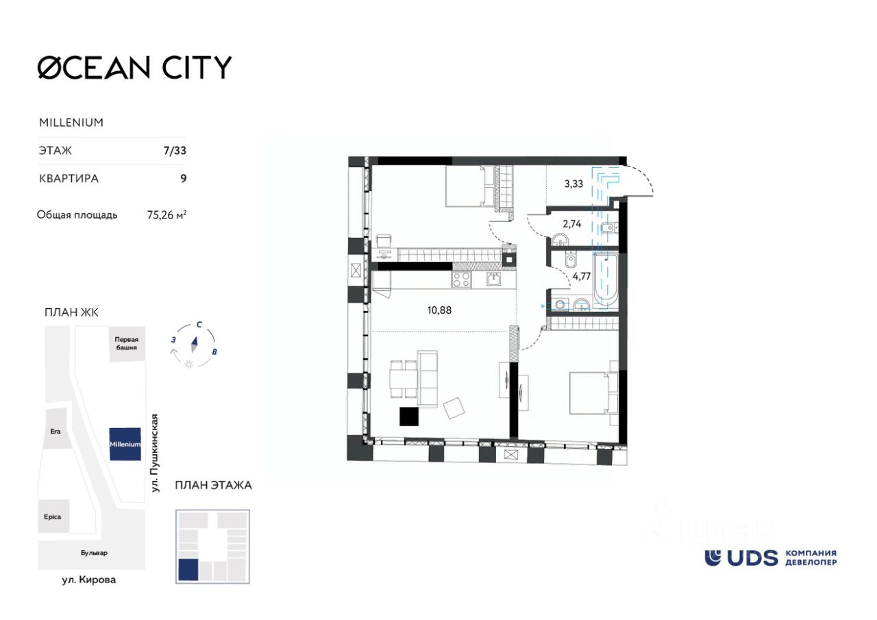 Лучший жилой небоскреб. Самый высокий дом в Ижевске, который видно даже с самолета. OCEAN CITY (ЖК Оушен сити) - для тех, кто хочет жить на высоте и ценит статус. Панорамные виды из окон, которые будут всегда с вами. Неземной двор на высоте 8 метров - эксклюзивная приватная территория только для резидентов OCEAN CITY (ЖК Оушен сити). Зоны отдыха, дизайнерские детские площадки, open-air тренажеры. 10 000 м² пешеходного бульвара "ОКЕАН" — стильное продолжение вашего пространства. Вечерние променады, уютные кафе, живая атмосфера — дорога домой превратиться в удовольствие. Бутиковый ритейл у вас под ногами — кофейни, рестораны, spa-салоны, премиальные магазины. На массаж и за кофе в тапочках, не выходя на улицу. Технологии комфорта нового поколения: Бесключевой доступ — дом распознаёт вас автоматически. Премиальные высокоскоростные лифты с увеличенными потолками — перемещения в стиле CITY. Свободные планировки — воплотите любую дизайн концепцию без границ. Панорамное остекление с интегрированным климат-контролем — идеальный микроклимат без компромиссов. Тёплый подземный паркинг 24/7 — ваш автомобиль в безопасности в любое время года. Инвестиция в престижную недвижимость — OCEAN CITY (ЖК ОКЕАН сити) не просто жильё, а актив, который будет расти в цене. При покупке недвижимости в домах UDS вы получаете в подарок 6 или 12 месяцев дополнительного сервиса отельного уровня. В зависимости от пакета в программу входит: масштабная уборка после ремонта, генеральная и регулярная поддерживающая уборка, химчистка мебели, мойка окон, глажка вещей, личный шеф-повар на праздник. Наслаждайтесь жизнью в новой квартире с первого дня и не думайте о бытовых вопросах.