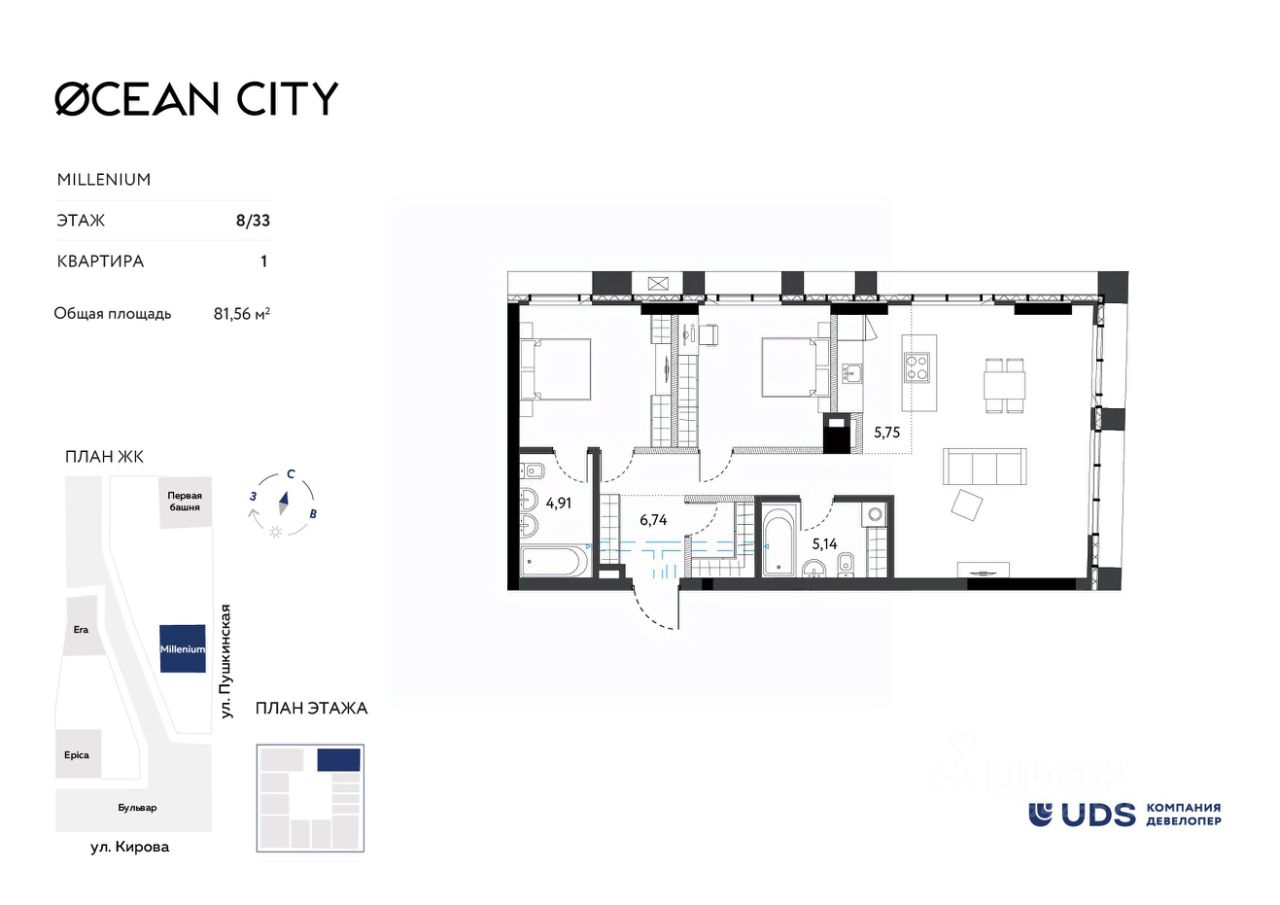 Лучший жилой небоскреб. Самый высокий дом в Ижевске, который видно даже с самолета. OCEAN CITY (ЖК Оушен сити) - для тех, кто хочет жить на высоте и ценит статус. Панорамные виды из окон, которые будут всегда с вами. Неземной двор на высоте 8 метров - эксклюзивная приватная территория только для резидентов OCEAN CITY (ЖК Оушен сити). Зоны отдыха, дизайнерские детские площадки, open-air тренажеры. 10 000 м² пешеходного бульвара "ОКЕАН" — стильное продолжение вашего пространства. Вечерние променады, уютные кафе, живая атмосфера — дорога домой превратиться в удовольствие. Бутиковый ритейл у вас под ногами — кофейни, рестораны, spa-салоны, премиальные магазины. На массаж и за кофе в тапочках, не выходя на улицу. Технологии комфорта нового поколения: Бесключевой доступ — дом распознаёт вас автоматически. Премиальные высокоскоростные лифты с увеличенными потолками — перемещения в стиле CITY. Свободные планировки — воплотите любую дизайн концепцию без границ. Панорамное остекление с интегрированным климат-контролем — идеальный микроклимат без компромиссов. Тёплый подземный паркинг 24/7 — ваш автомобиль в безопасности в любое время года. Инвестиция в престижную недвижимость — OCEAN CITY (ЖК ОКЕАН сити) не просто жильё, а актив, который будет расти в цене. При покупке недвижимости в домах UDS вы получаете в подарок 6 или 12 месяцев дополнительного сервиса отельного уровня. В зависимости от пакета в программу входит: масштабная уборка после ремонта, генеральная и регулярная поддерживающая уборка, химчистка мебели, мойка окон, глажка вещей, личный шеф-повар на праздник. Наслаждайтесь жизнью в новой квартире с первого дня и не думайте о бытовых вопросах.