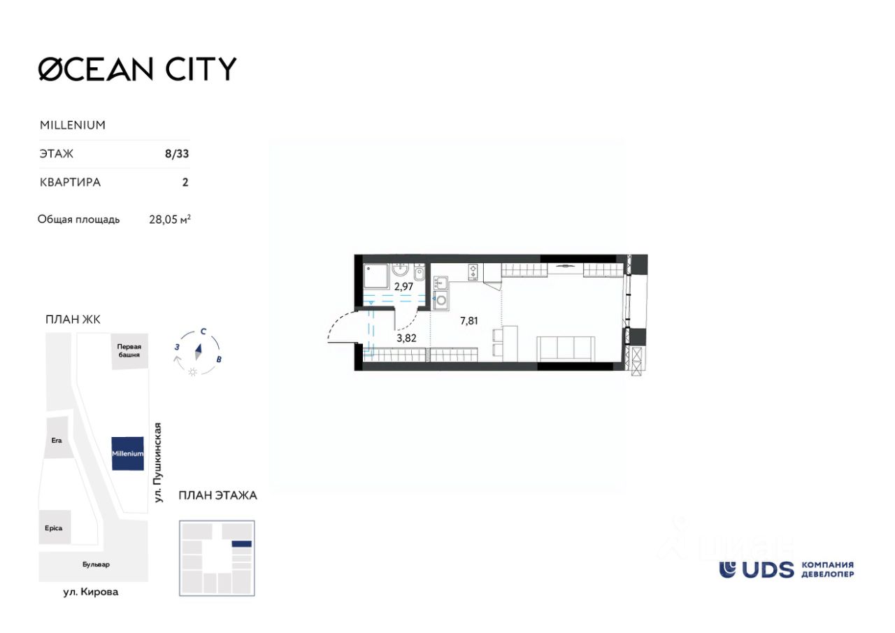 Лучший жилой небоскреб. Самый высокий дом в Ижевске, который видно даже с самолета. OCEAN CITY (ЖК Оушен сити) - для тех, кто хочет жить на высоте и ценит статус. Панорамные виды из окон, которые будут всегда с вами. Неземной двор на высоте 8 метров - эксклюзивная приватная территория только для резидентов OCEAN CITY (ЖК Оушен сити). Зоны отдыха, дизайнерские детские площадки, open-air тренажеры. 10 000 м² пешеходного бульвара "ОКЕАН" — стильное продолжение вашего пространства. Вечерние променады, уютные кафе, живая атмосфера — дорога домой превратиться в удовольствие. Бутиковый ритейл у вас под ногами — кофейни, рестораны, spa-салоны, премиальные магазины. На массаж и за кофе в тапочках, не выходя на улицу. Технологии комфорта нового поколения: Бесключевой доступ — дом распознаёт вас автоматически. Премиальные высокоскоростные лифты с увеличенными потолками — перемещения в стиле CITY. Свободные планировки — воплотите любую дизайн концепцию без границ. Панорамное остекление с интегрированным климат-контролем — идеальный микроклимат без компромиссов. Тёплый подземный паркинг 24/7 — ваш автомобиль в безопасности в любое время года. Инвестиция в престижную недвижимость — OCEAN CITY (ЖК ОКЕАН сити) не просто жильё, а актив, который будет расти в цене. При покупке недвижимости в домах UDS вы получаете в подарок 6 или 12 месяцев дополнительного сервиса отельного уровня. В зависимости от пакета в программу входит: масштабная уборка после ремонта, генеральная и регулярная поддерживающая уборка, химчистка мебели, мойка окон, глажка вещей, личный шеф-повар на праздник. Наслаждайтесь жизнью в новой квартире с первого дня и не думайте о бытовых вопросах.