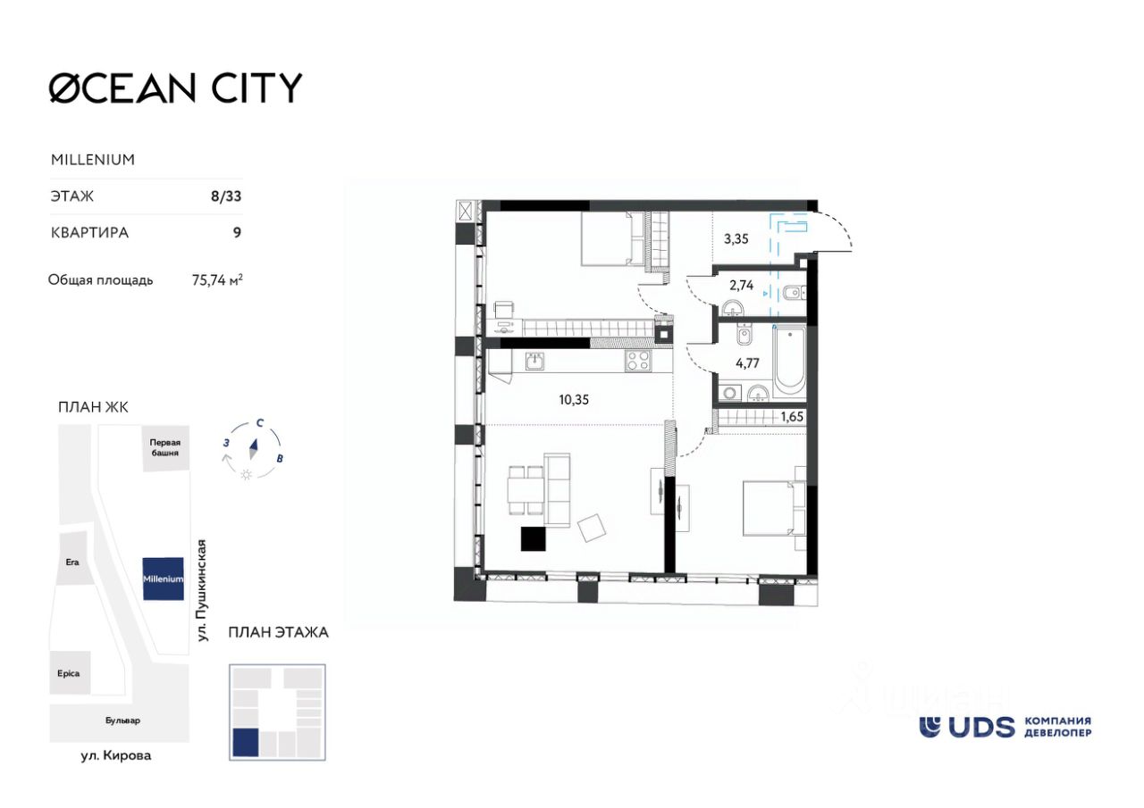 Лучший жилой небоскреб. Самый высокий дом в Ижевске, который видно даже с самолета. OCEAN CITY (ЖК Оушен сити) - для тех, кто хочет жить на высоте и ценит статус. Панорамные виды из окон, которые будут всегда с вами. Неземной двор на высоте 8 метров - эксклюзивная приватная территория только для резидентов OCEAN CITY (ЖК Оушен сити). Зоны отдыха, дизайнерские детские площадки, open-air тренажеры. 10 000 м² пешеходного бульвара "ОКЕАН" — стильное продолжение вашего пространства. Вечерние променады, уютные кафе, живая атмосфера — дорога домой превратиться в удовольствие. Бутиковый ритейл у вас под ногами — кофейни, рестораны, spa-салоны, премиальные магазины. На массаж и за кофе в тапочках, не выходя на улицу. Технологии комфорта нового поколения: Бесключевой доступ — дом распознаёт вас автоматически. Премиальные высокоскоростные лифты с увеличенными потолками — перемещения в стиле CITY. Свободные планировки — воплотите любую дизайн концепцию без границ. Панорамное остекление с интегрированным климат-контролем — идеальный микроклимат без компромиссов. Тёплый подземный паркинг 24/7 — ваш автомобиль в безопасности в любое время года. Инвестиция в престижную недвижимость — OCEAN CITY (ЖК ОКЕАН сити) не просто жильё, а актив, который будет расти в цене. При покупке недвижимости в домах UDS вы получаете в подарок 6 или 12 месяцев дополнительного сервиса отельного уровня. В зависимости от пакета в программу входит: масштабная уборка после ремонта, генеральная и регулярная поддерживающая уборка, химчистка мебели, мойка окон, глажка вещей, личный шеф-повар на праздник. Наслаждайтесь жизнью в новой квартире с первого дня и не думайте о бытовых вопросах.
