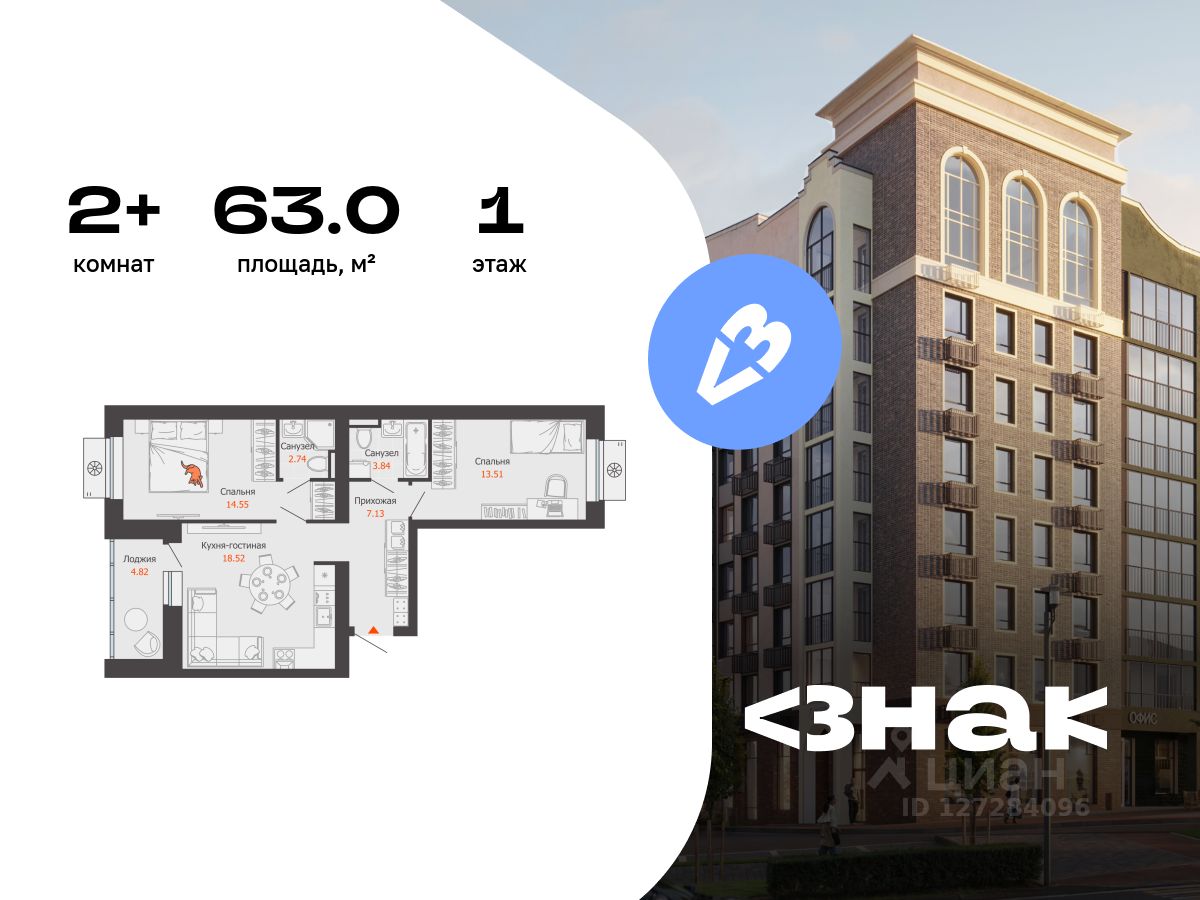 В новом жилом комплексе комфорт-класса "Знак" продается 2-комнатная квартира площадью 63.00 кв. м с отделкой white box. Квартира находится на 1 этаже 7-этажного корпуса 2. Девелопер проекта - федеральный застройщик "Железно".