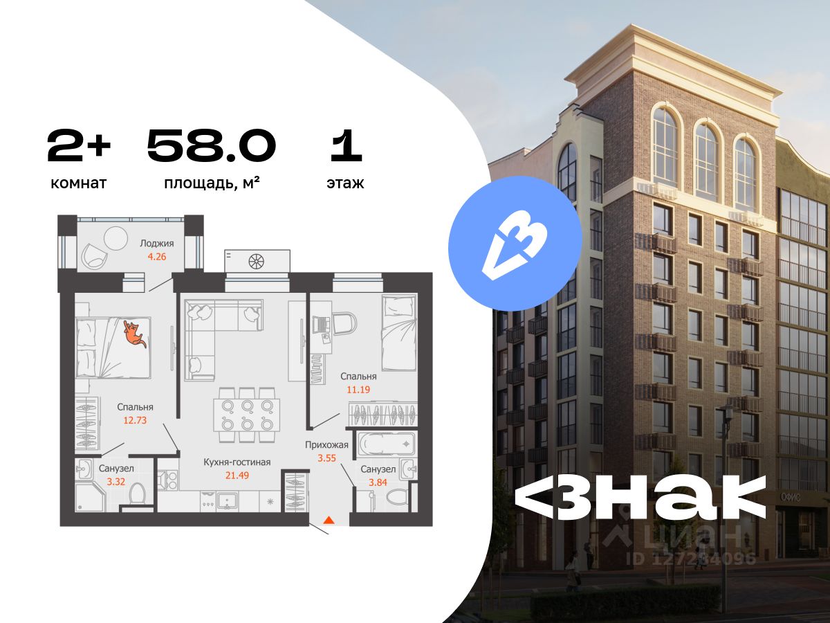 В новом жилом комплексе комфорт-класса "Знак" продается 2-комнатная квартира площадью 58.00 кв. м с отделкой white box. Квартира находится на 1 этаже 7-этажного корпуса 2. Девелопер проекта - федеральный застройщик "Железно".