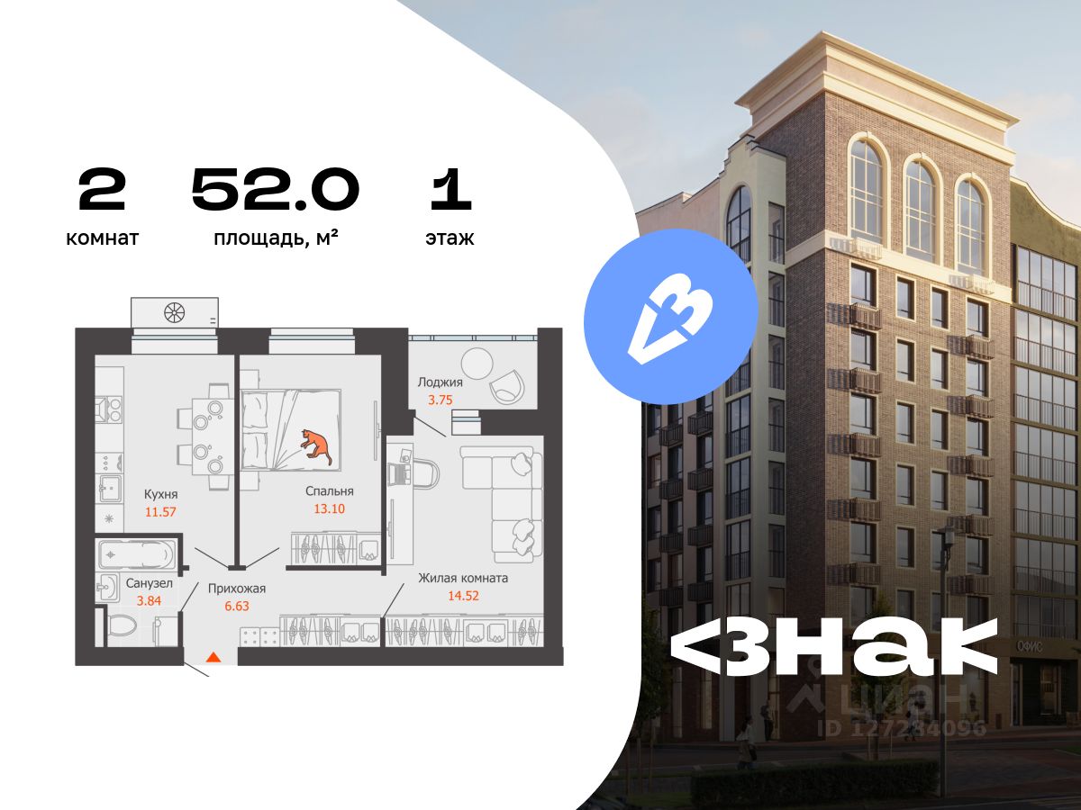 В новом жилом комплексе комфорт-класса "Знак" продается 2-комнатная квартира площадью 52.00 кв. м с отделкой white box. Квартира находится на 1 этаже 7-этажного корпуса 2. Девелопер проекта - федеральный застройщик "Железно".