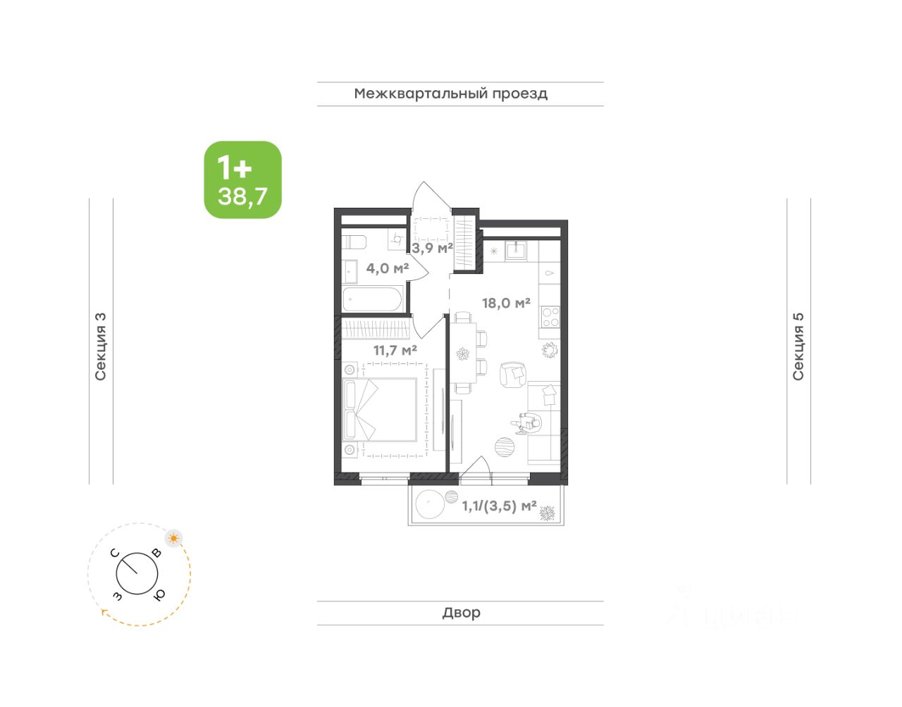 Площадь 38,7 кв.м. с совмещенной кухней-гостиной, обособленной спальней, личной гардеробной и возможностью оборудовать рабочее место.