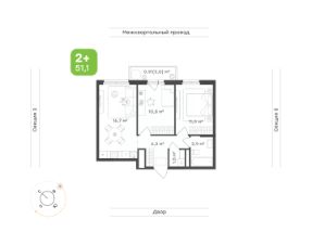 Общая площадь 51,1 кв.м., включая собственную гардеробную комнату.