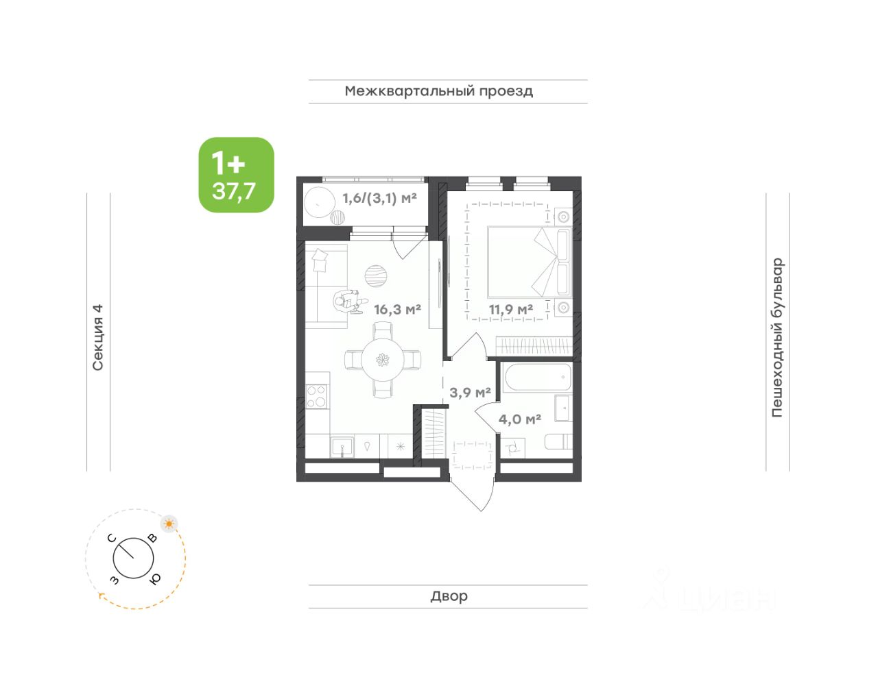 Площадь 37,7 кв.м. с объединенной зоной кухни, столовой и гостиной, а также отдельная спальня.