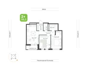 Площадь 55,3 кв.м. с двумя спальнями, двумя санузлами, кухней-гостиной и продуманным зонированием.