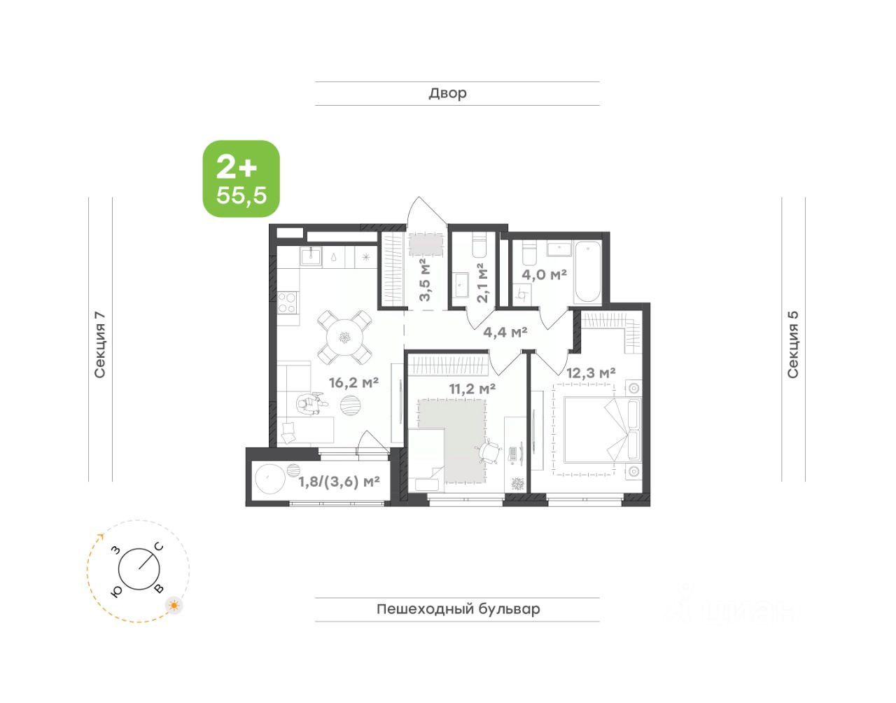 Площадь 55,5 кв.м. с двумя спальнями, двумя санузлами, кухней-гостиной и продуманным зонированием.