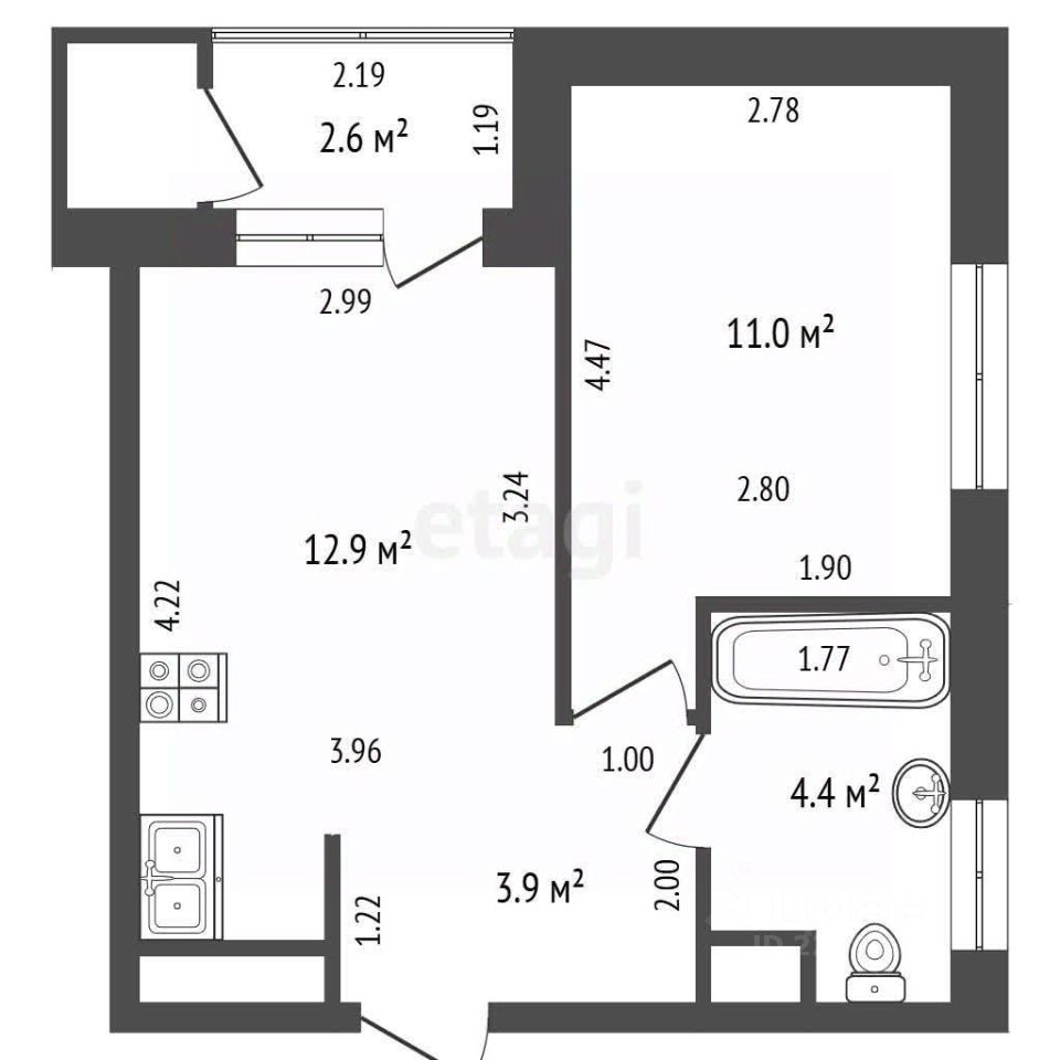 Кухня-гостиная для семейных вечеров + уютная спальня для отдыха. Совмещённый санузел с окном — редкость, которая дарит свет и свежесть.