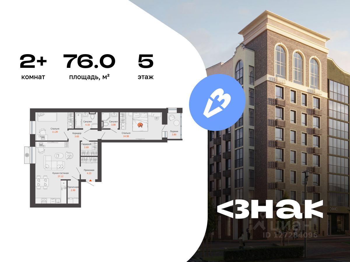 В новом жилом комплексе комфорт-класса "Знак" продается 2-комнатная квартира площадью 76.00 кв. м с отделкой white box. Квартира находится на 5 этаже 7-этажного корпуса 1. Девелопер проекта - федеральный застройщик "Железно".
