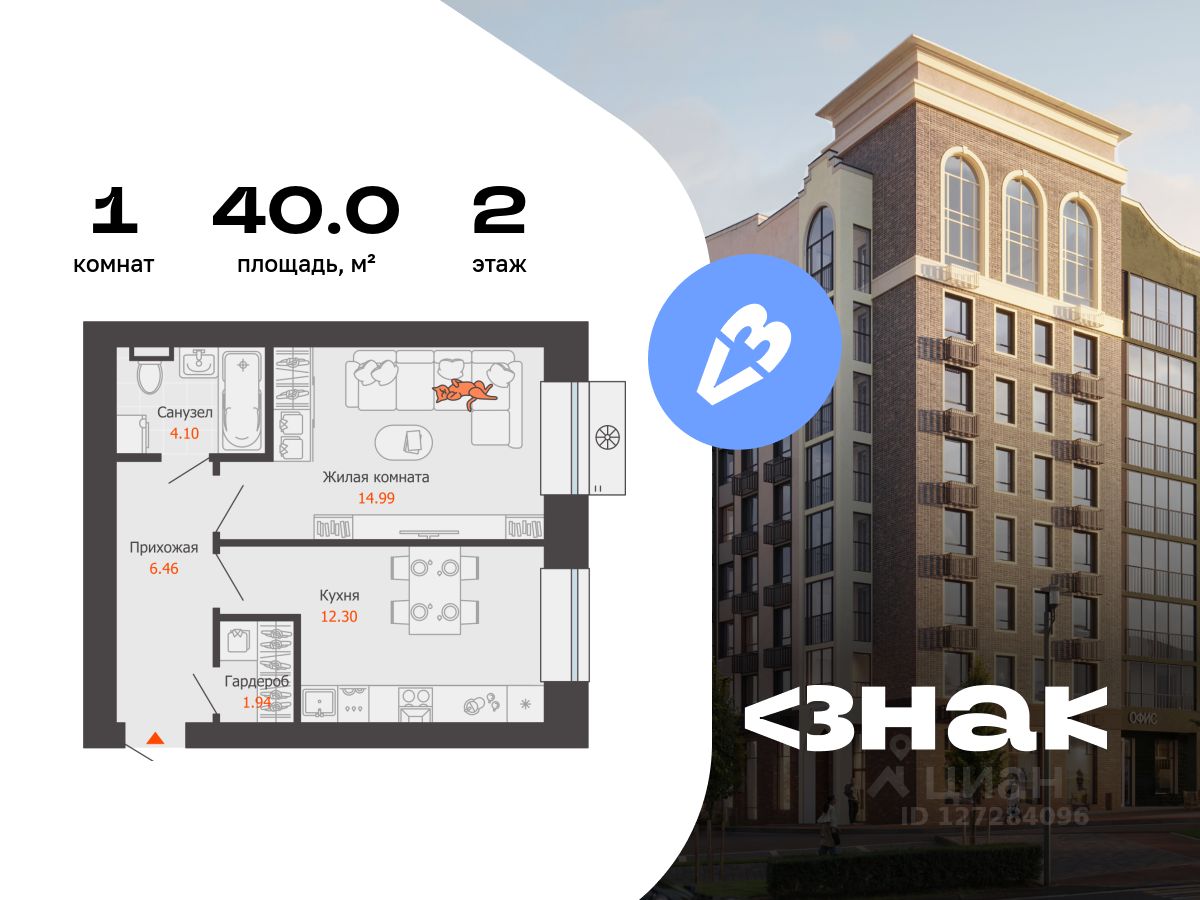 В новом жилом комплексе комфорт-класса "Знак" продается 1-комнатная квартира площадью 40.00 кв. м с отделкой white box. Квартира находится на 2 этаже 8-этажного корпуса 1. Девелопер проекта - федеральный застройщик "Железно".