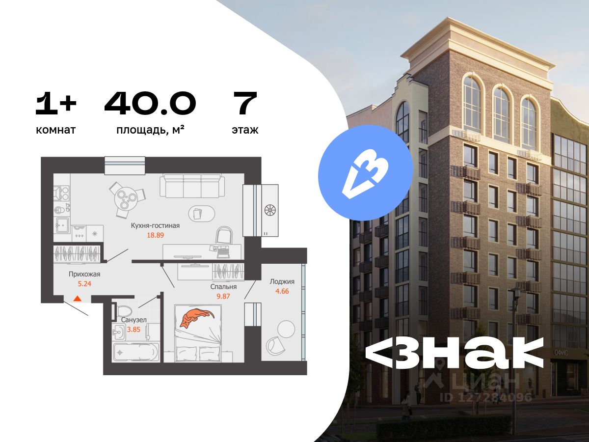 В новом жилом комплексе комфорт-класса "Знак" продается 1-комнатная квартира площадью 40.00 кв. м с отделкой white box. Квартира находится на 7 этаже 7-этажного корпуса 1. Девелопер проекта - федеральный застройщик "Железно".