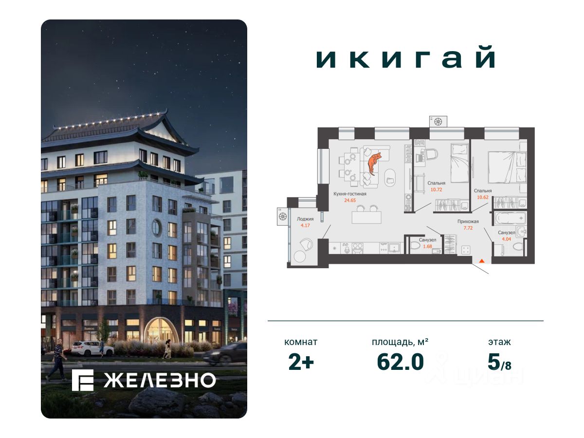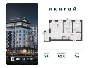 Продается 2-комнатная квартира площадью 62.00 кв. м с предчистовой отделкой. Квартира находится в жилом комплексе комфорт+ "Икигай" от федерального девелопера "Железно".
