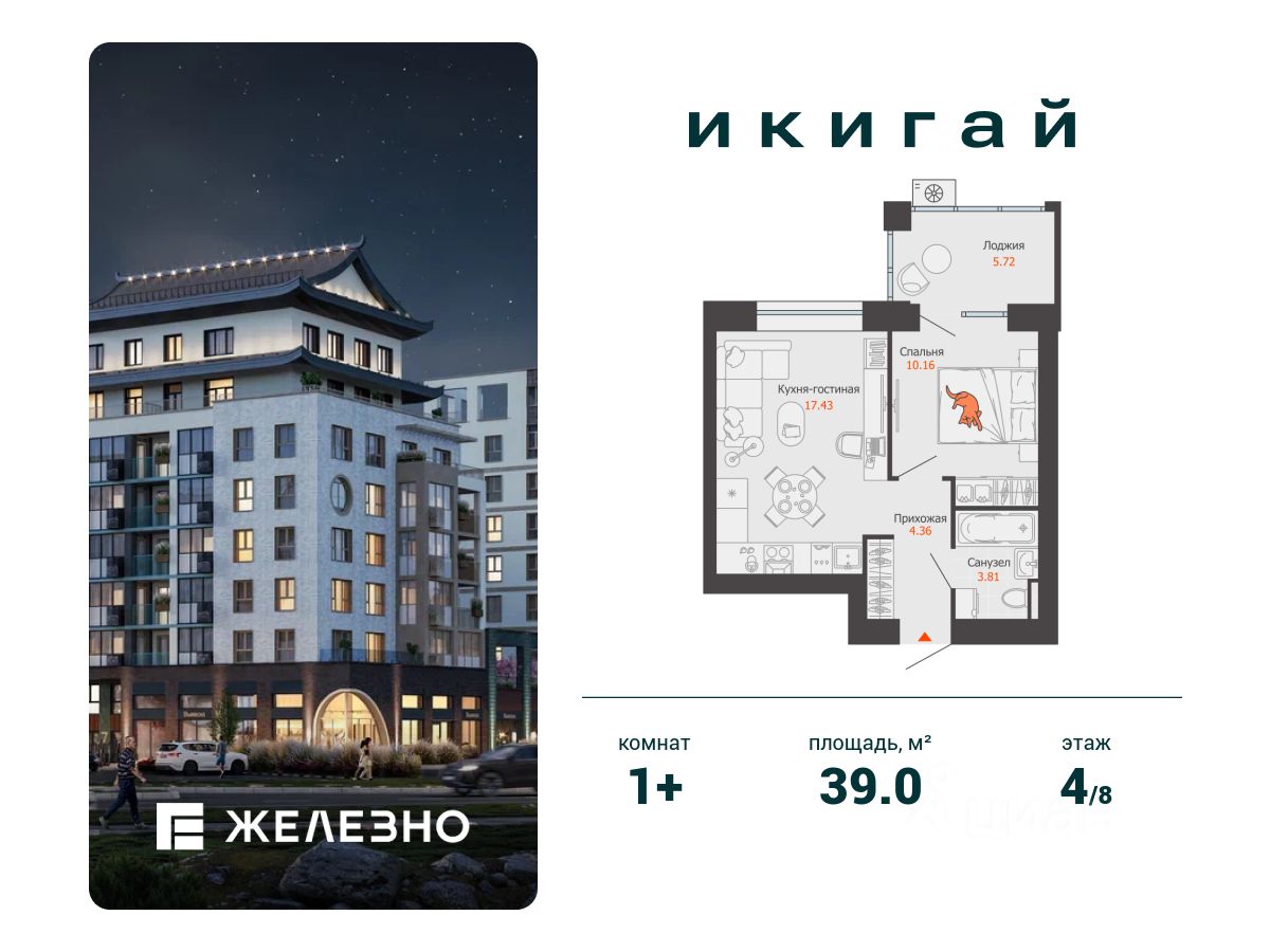 Продается 1-комнатная квартира площадью 39.00 кв. м с предчистовой отделкой. Квартира находится в жилом комплексе комфорт+ "Икигай" от федерального девелопера "Железно".