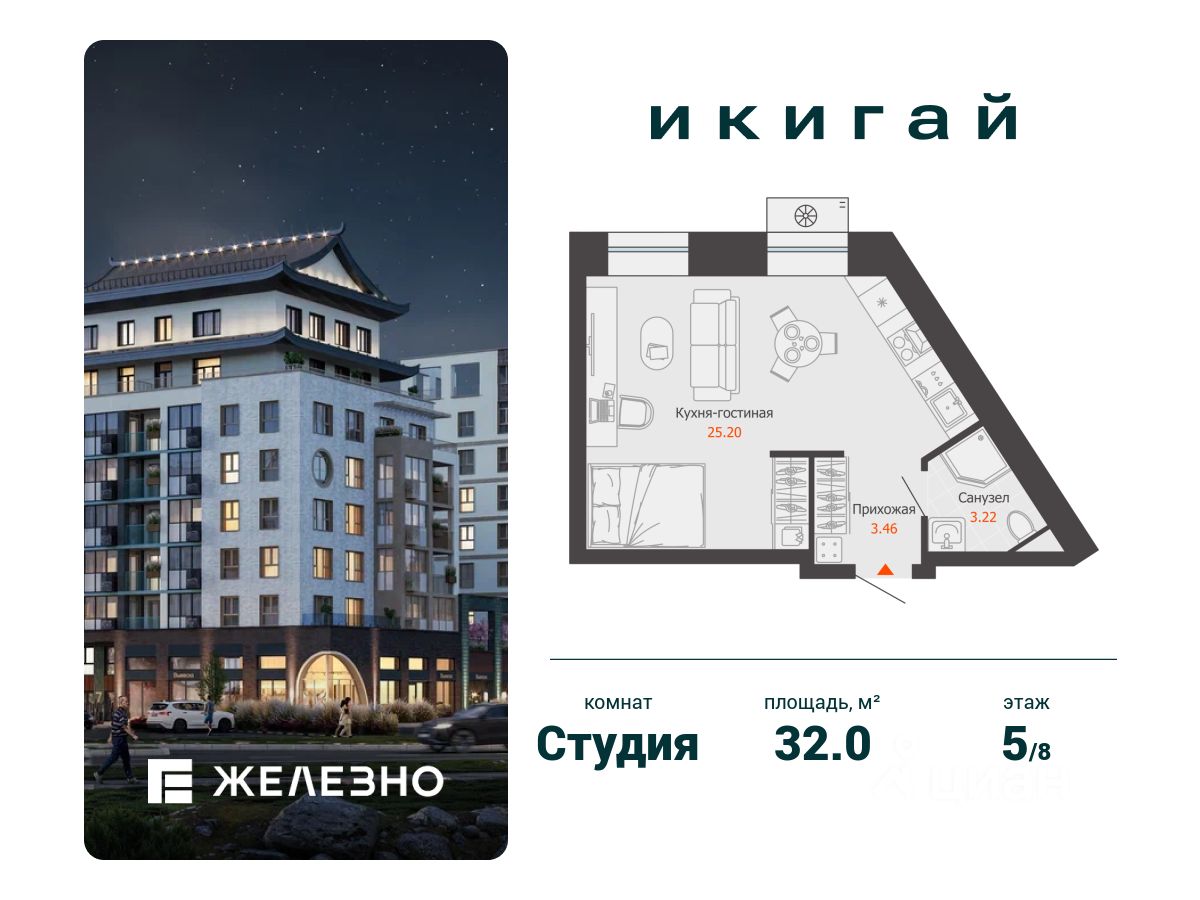 Продается студия площадью 32.00 кв. м с предчистовой отделкой. Квартира находится в жилом комплексе комфорт+ "Икигай" от федерального девелопера "Железно".