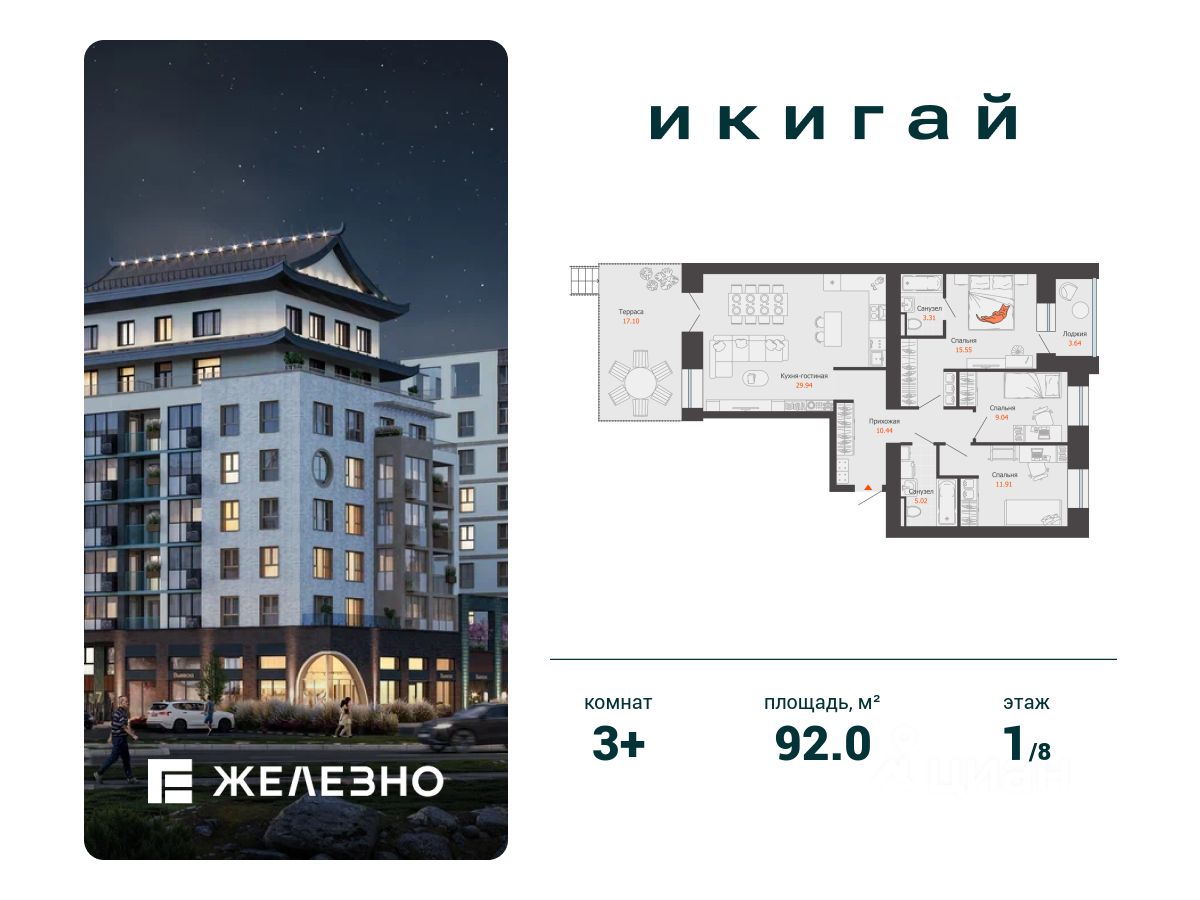 Продается 3-комнатная квартира площадью 92.00 кв. м с предчистовой отделкой. Квартира находится в жилом комплексе комфорт+ "Икигай" от федерального девелопера "Железно".