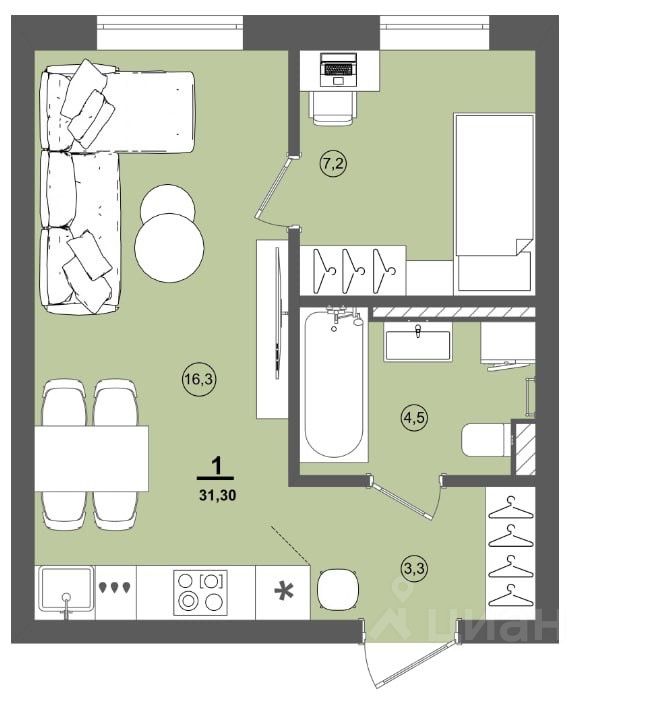 Эффектная планировка: совмещенная кухня-ниша с гостиной 16,3 кВ.м. и отдельная зона для сна. Здесь каждый квадратный метр использован с умом - даже ваши тапочки найдут свое место!