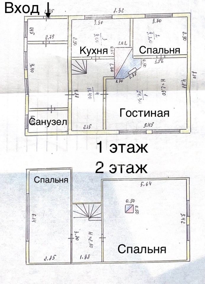 на 1 этаже расположены холл, санузел, кухня, гостиная и спальня.