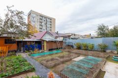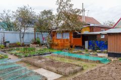 Огород с грядками, плодородные посадки (яблоня, смородина), бетонные дорожки.