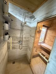 В доме 2 изолированные спальные комнаты, кухня-гостиная, санузел, душевая и сауна.