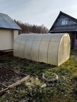 На участке посажены 3 яблони, есть кусты смородины, вишни, крыжовника, малины. Есть теплица 4 метра.