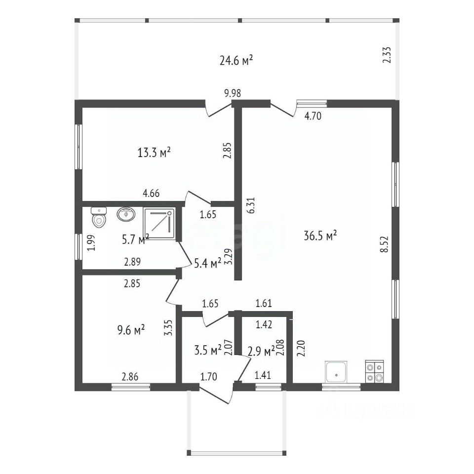 Подробнее о доме: 105,7м2 (без учета крыльца и террасы) формата 2+ (кухня-столовая=36,5м2; 2 отдельные спальни по 13,3м2 и 9,6м2; 1 с/у=5,7м2; тамбур=3,5м2; холл=5,4м2; котельная=2,9м2)