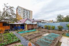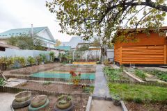 Огород с грядками, плодородные посадки (яблоня, смородина), бетонные дорожки.