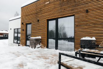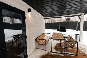 Приезжаете — всё уже тёплое, освещённое и готово к отдыху, к бане пристроен навес с террассой и зоной барбекю.