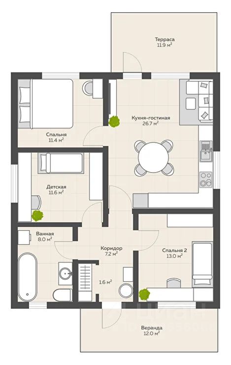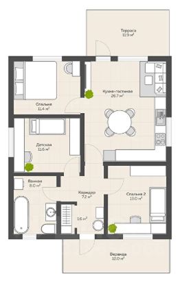 В доме три изолированные комнаты и просторная кухня - гостиная.