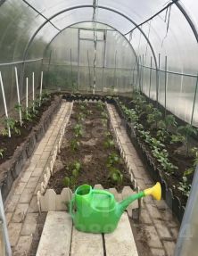 Участок благоустроен: две теплицы, девять оцинкованных грядок, площадка под бассейн (36 кв. м), плодовые деревья и кустарники. По периметру установлен забор, автоматические ворота и видеонаблюдение. Дом подключен к центральным канализации и водоснабжению, отопление обеспечивает газовый котел Bosch.