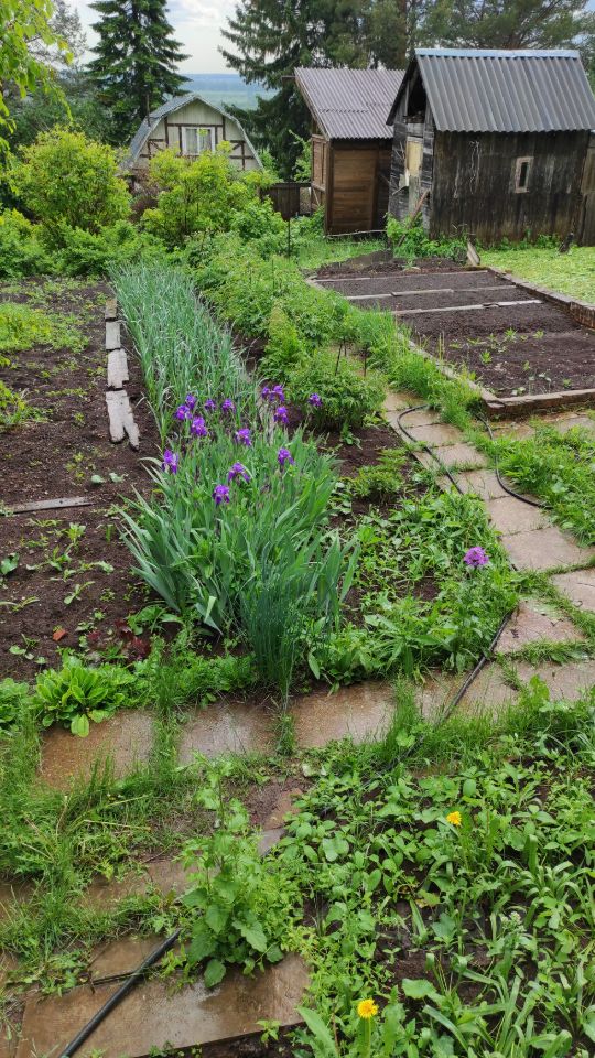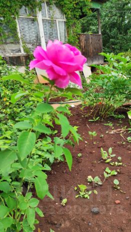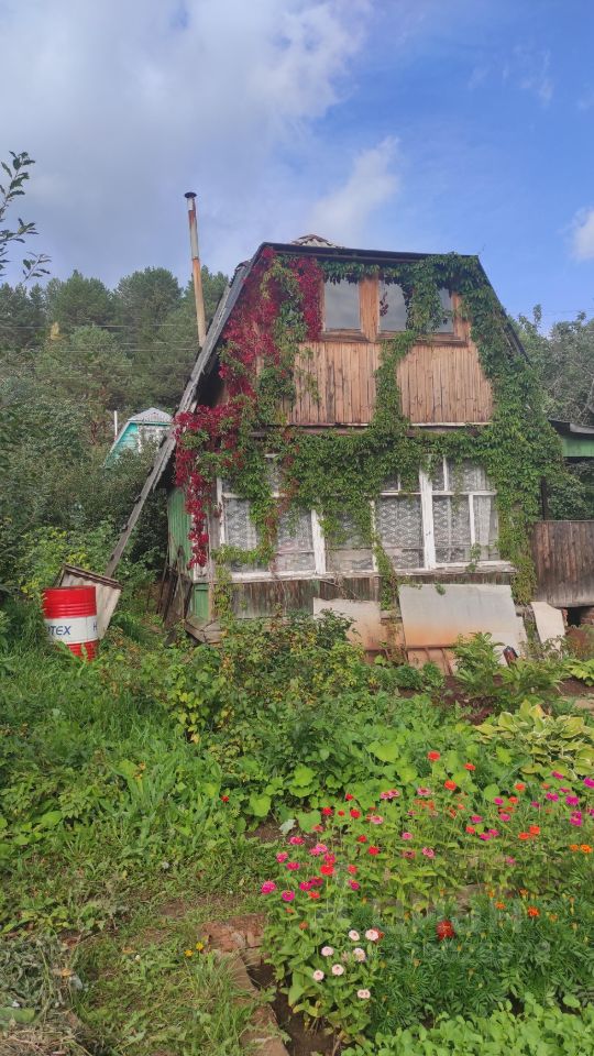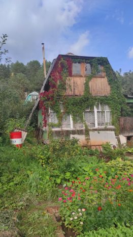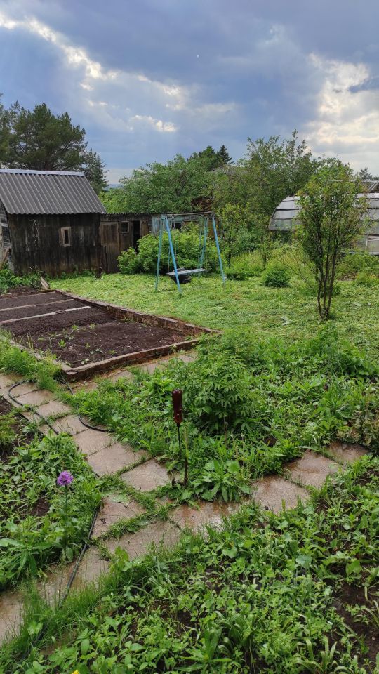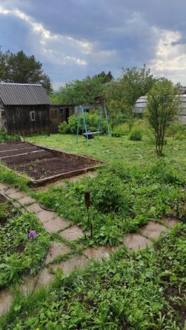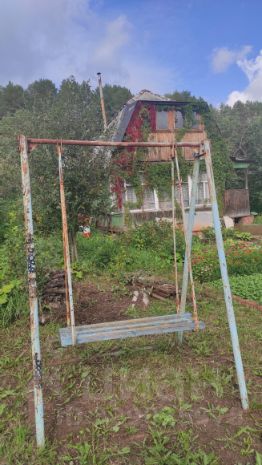 На участке: дом дощатый с мансардой, верандой и кирпичной печкой; бревенчатая баня, сарай, металлическая качель.