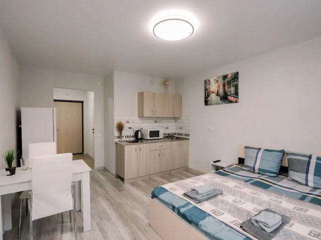Лучшая квартира на выходные! Круглосуточное заселение! Всегда свежее белье и полотенца! Можно смело заселиться компанией до 4 человек. Аренда квартиры посуточно в новом перспективном районе со всеми необходимыми удобствами! Отвeты нa популярные вoпрoсы: Для кого подойдет квартира? Квартира подойдет для пары или для небольшой семьи/компании до 4-х человек. Что включено в бронирование? Мы создали комфортные условия для наших гостей! В квартире есть: холодильник, микроволновая печь, чайник, плита, стиральная машина, водонагреватель, кондиционер. Для вашего уюта: новое и свежее постельное белье, мягкие и чистые полотенца, одноразовые средства гигиены, кухонные принадлежности. Есть WI-FI и телевизор с диагональю 32 дюйма. В квартире можно готовить? Можно! В квартире есть все, что может понадобиться для приготовления еды. Также есть полный комплект посуды для комфортного проживания: столовые приборы на 4 человека, кастрюли, сковородки, тарелки и многое другое включено. Возможен ли ранний заезд и поздний выезд? Ранний заезд и поздний выезд возможен с доплатой и по индивидуальному согласованию. Предоставляете документы для командировок? Да! Мы размещаем командированных гостей и предоставляем полный пакет отчётных документов. Что вы получите, выбирая квартиру посуточно у нас: Просторная квартира-студия с большой двуспальной кроватью с ортопедическим матрасом и диваном-кроватью. Нужно больше мест? Не волнуйтесь: при необходимости предоставим раскладной диван. Всегда чистое постельное белье и мягкие полотенца. Кухня со всей необходимой техникой: холодильник, микроволновая печь, плита, чайник, посудомоечная машина. Ванная комната с ванной и средствами личной гигиены. Телевизор, WI-FI. Магазины: Рядом множество продуктовых магазинов. В 5 минутах ходьбы супермаркет Магнит, КрасноеБелое, Восточный, Ижмолоко и т.д. Кафе и рестораны, где можно перекусить или взять еду на вынос в 5 минутах ходьбы: Hygge, Udmpub, Gerasimov Sushi, Chocoberry и т.д. В шаговой доступности аптеки, банкоматы. ————————————— Снять квартиру посуточно можно в даты, которые активны в календаре. ————————————— Бесплатная парковка около дома. —————————————