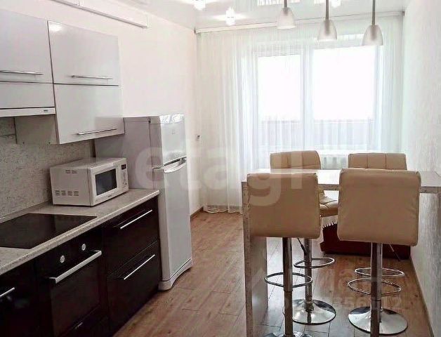 Сдаётся просторная евродвушка с дизайнерским ремонтом в современном стиле, расположенная на 15 этаже 17-этажного дома в ЖК "Снегири" по адресу: Ижевск, 7-я Подлесная улица, 100к2, Октябрьский район. Общая площадь квартиры составляет 44.5 м². Вас ждёт светлая и уютная кухня-гостиная площадью 14.4 м² с полным гарнитуром, удобной барной стойкой с поворотными стульями, компактным раздвижным диванчиком и всей необходимой техникой: холодильник, электрическая плита, духовой шкаф, микроволновая печь, электрический чайник и вытяжка.