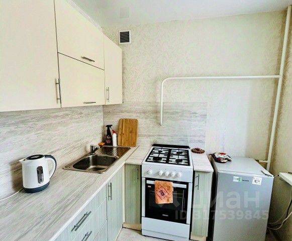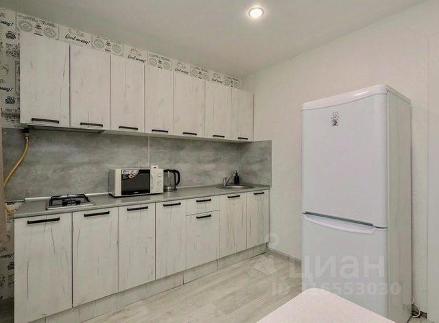 Вся необходимая бытовая техника на кухне: чайник, СВЧ, плита, холодильник и столовые принадлежности.